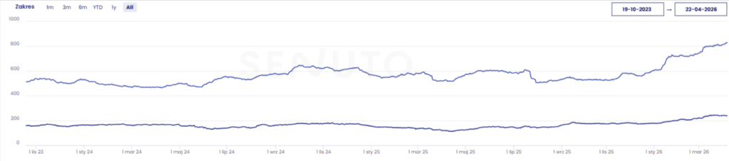 Widoczny na wykresie równoległy wzrost Domain Rating oraz liczby domen linkujących pokazuje, jak skutecznie realizowana strategia link buildingowa przełożyła się na systematyczne wzmacnianie autorytetu serwisu. Szczególnie dynamiczny przyrost w środkowej i końcowej fazie okresu potwierdza skalowanie działań oraz rosnącą siłę domeny w konkurencyjnym środowisku. Efektem jest nie tylko poprawa parametrów SEO, ale przede wszystkim stabilne fundamenty pod dalszy wzrost widoczności i ruchu organicznego.
